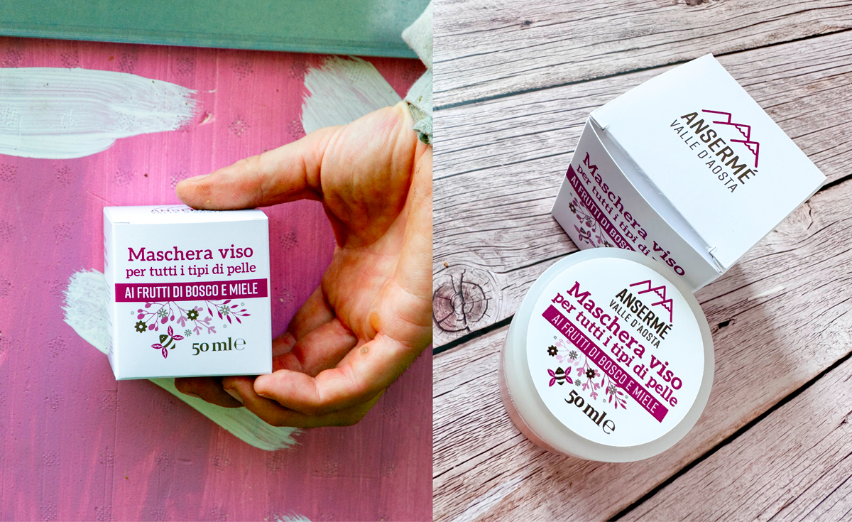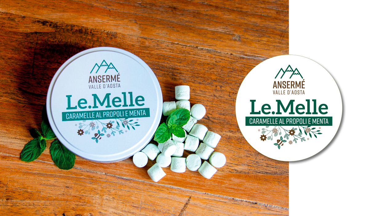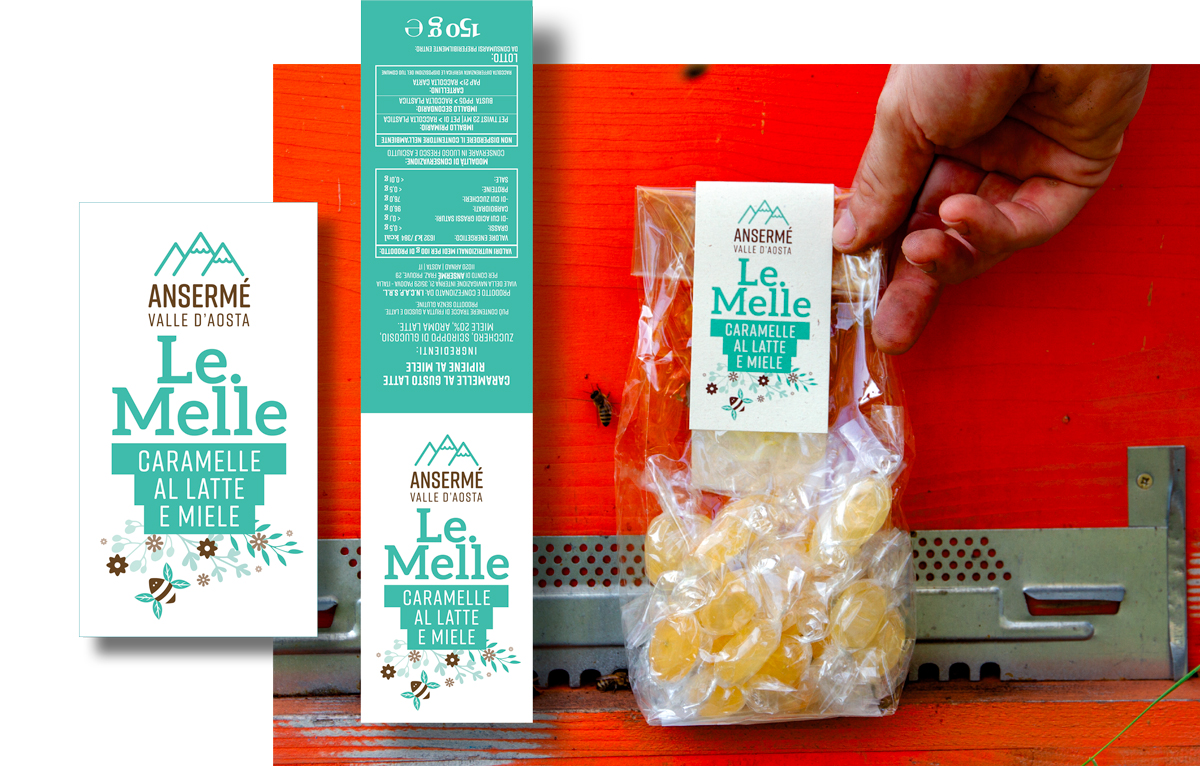 Per caratterizzare la linea dei prodotti è stata realizzata un’apina stilizzata, il cui colore delle ali, varia in base alla tipologia di miele, biscotto o cosmetico.