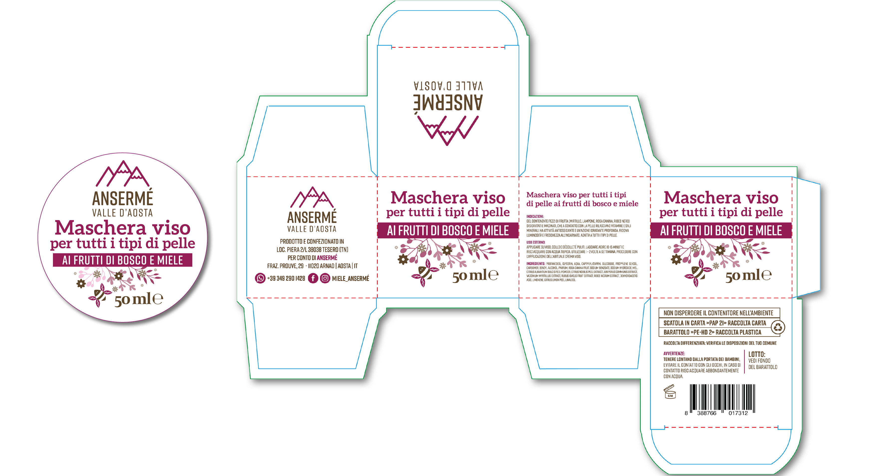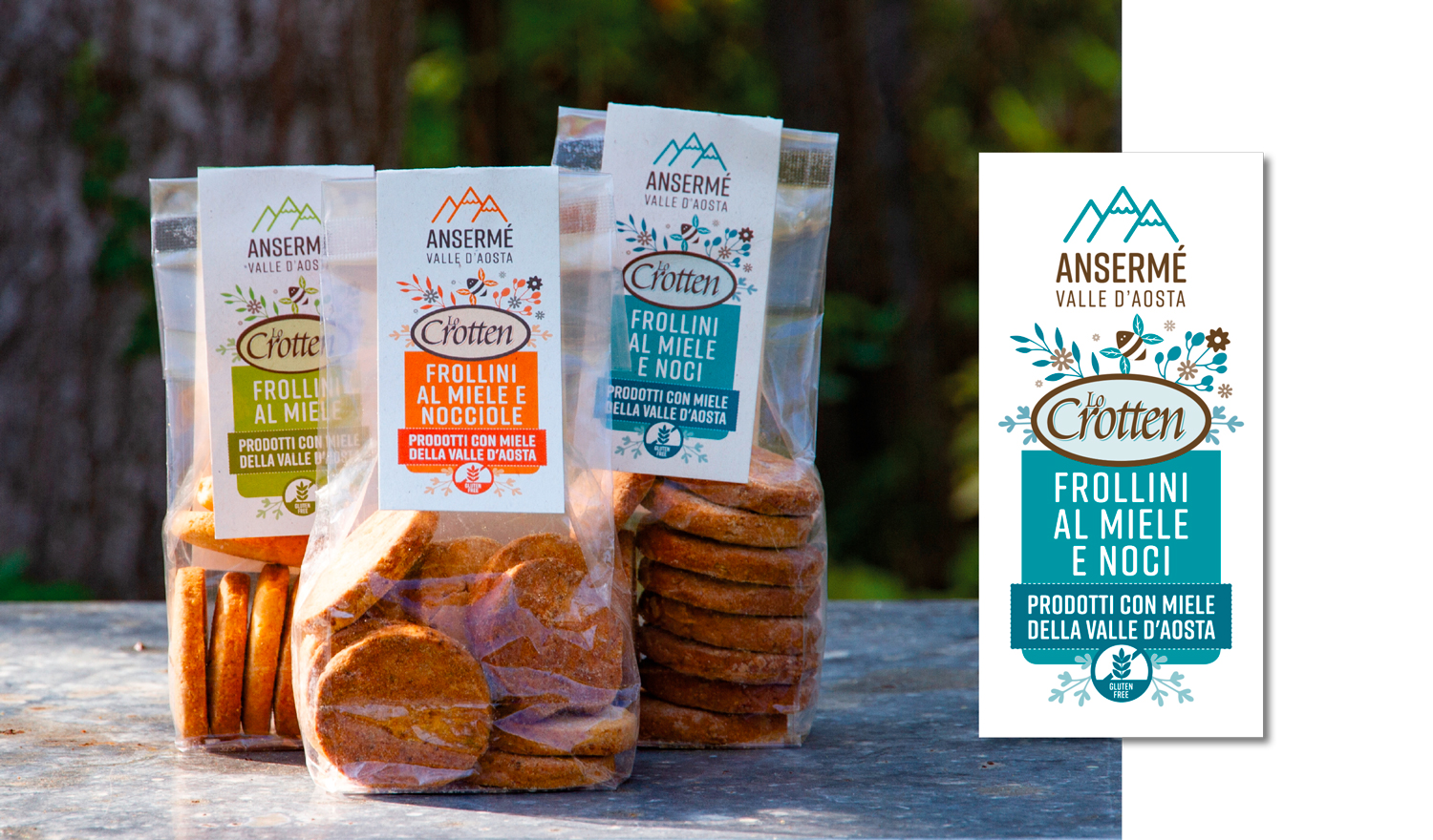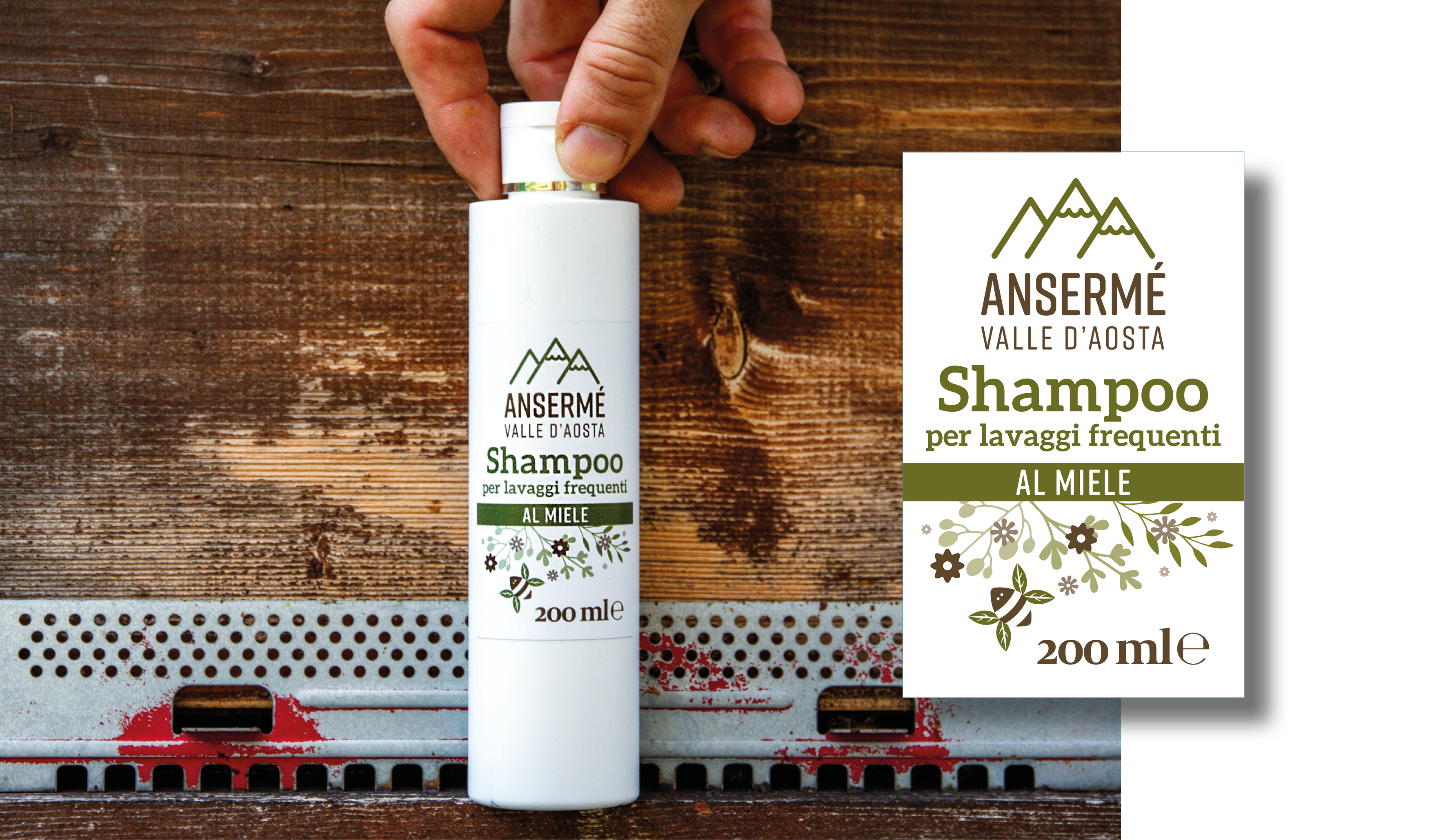 Per caratterizzare la linea dei prodotti è stata realizzata un’apina stilizzata, il cui colore delle ali, varia in base alla tipologia di miele, biscotto o cosmetico.